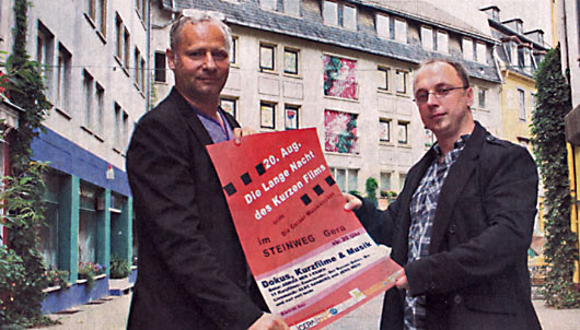 Olaf Böhme (links), Medienassistent beim Offenen Kanal Gera, und der Geraer Filmemacher Marcel Dally hatten die Idee für die ?Lange Nacht des kurzen Films?. Hinter ihnen, an der Fassade des Eckhauses im Geraer Steinweg, soll am 20. August die große Leinwand hängen.