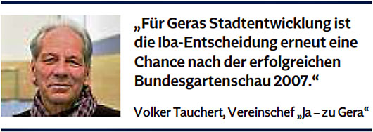 Es geht aber um mehr, als Dreckecken aufzuräumen und ein Bürgerbewusstsein dafür zu schaffen, keinen Müll auf die Straße zu werfen und den Hundekot sofort wegzumachen. „Ein absoluter Schwerpunkt für unseren Verein ist die Entwicklung von Geras Neuer Mitte“, erklärt Vereinschef Tauchert, der sich Gera aufs Engste verbunden fühlt – und das bereits seit Vorwendezeiten. Als 2014 der erste Projektaufruf der Internationalen Bauausstellung Thüringens (IBA) bekannt wurde, hat sich der Verein beworben. „Zusammen mit einem Projekt der Stadt Gera wurden wir einer der 16 gekürten Iba-Kandidaten“, ist er stolz – insgesamt hatte es 248 Projekteinreichungen gegeben. „Für Geras Stadtentwicklung ist diese  Entscheidung erneut eine Chance nach der erfolgreichen Bundesgartenschau 2007“, verweist Tauchert auf die Möglichkeiten, die sich für die Stadt jetzt auftun.